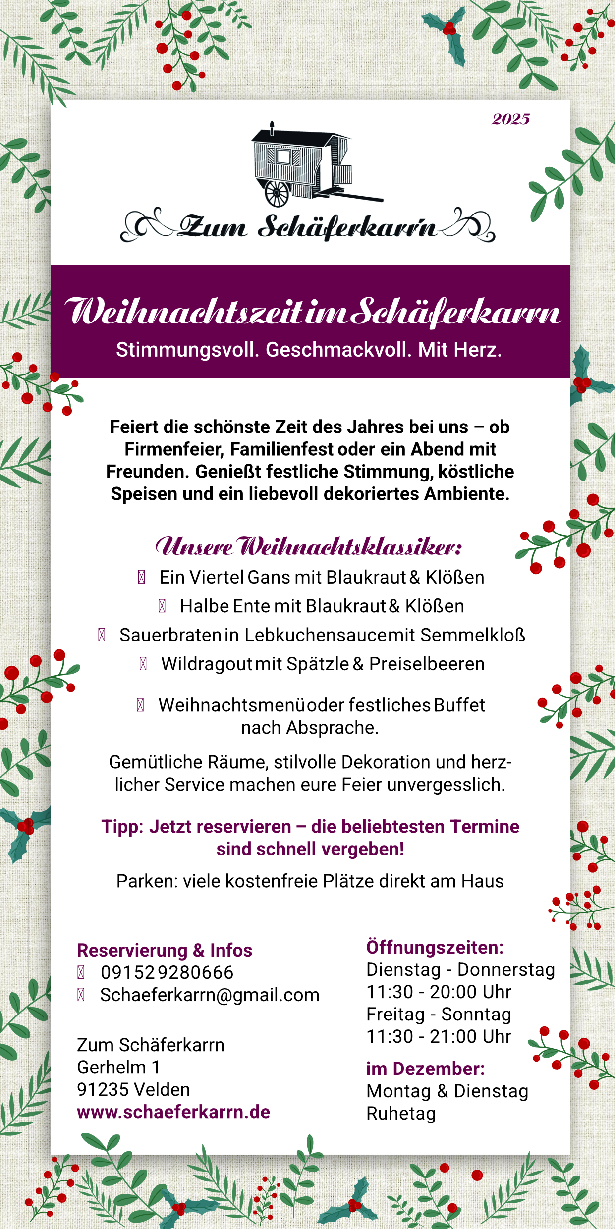 wir möchten Sie darüber informieren, dass der Schäferkarrn in den Monaten Januar und Februar eine wohlverdiente Winterpause einlegt. Diese Zeit nutzen wir, um unser Team zu stärken, neue Ideen zu entwickeln und unsere Abläufe sowie unsere Küche weiter zu verfeinern – damit wir Ihnen ab Frühjahr noch mehr Qualität, Genuss und Herzlichkeit bieten können.